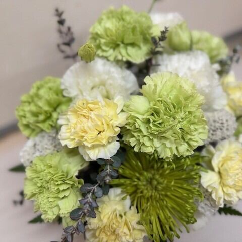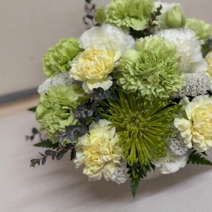 【お花の内容】 サイズ:H28 × W32 × D23 白・グリーン・黄色系のお花で作るナチュラルカラーのアレンジです♪ インテリアにも合わせやすいカラーなのでギフトとしての贈り物や、 落ち着いた色合いなのでお供えの贈り物にもピッタリです♪ ※ ≪注意事項 必ずお読みください≫ ※ 【ご法要などお供え花としてご利用の場合】 ・この商品のご注文の際には「配送オプション」にて必ず配達日時をご指定下さい ・配達日時のご指定が無く、ご連絡も取れない場合には最短(ご注文確定日の翌々日)での お届けとさせて頂きますのでご了承ください ・メッセージカードやお名札が必要な場合は、備考欄へ必ずご記入ください ・お届け先様がご不在の際には「不在票」を投函し、ご連絡を頂いてからの再度配達 となりますのでご了承ください(2日以上、お届け先様よりご連絡が無い場合、 ご注文主様へご連絡いたします) 【お通夜など葬儀会場へのお届の場合】 ・ご注文の際には「配送オプション」は使用せず備考欄へ「お通夜の日時」「お名札の名前」を必ずご記入 ください ※ご記入がなく、ご連絡も取れない場合には注文主様名のお名札にてお届けとなりますのでご了承ください