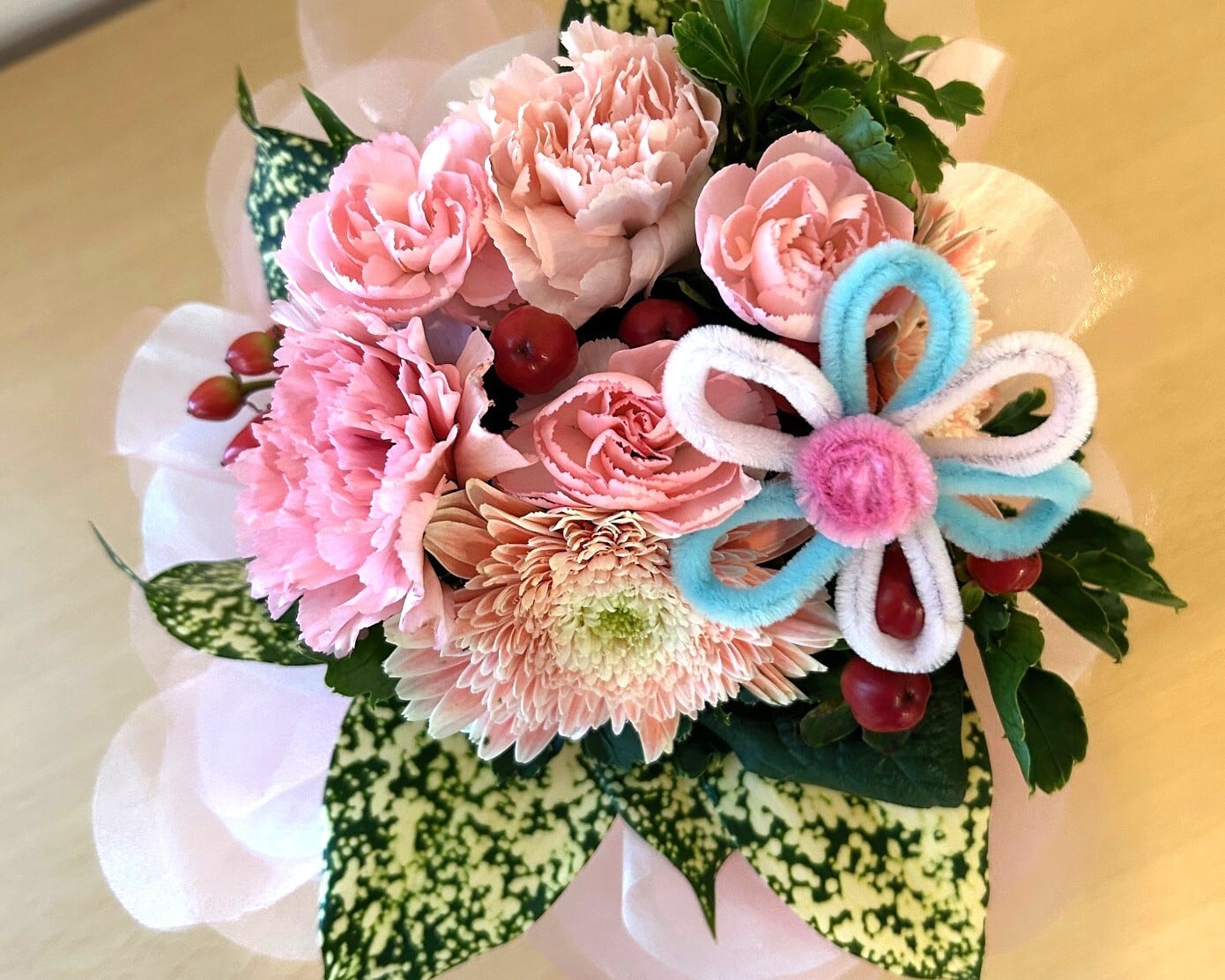 【お花の内容】 サイズ:H20 × W22 × D22 人気のスタンディングブーケ♪♪ そのまま飾れるタイプの花束(ブーケ)です✿ フリフリレースのラッピング&モコモコ可愛いお花のモールピックがアクセント♪ 〈スタンディングブーケとは?〉 水が入った容器に花束が入っているので、花瓶がなくてもそのまま飾ることができます♪ 〈長持ちのポイント〉 水が減ったり、にごったりしたらお水をお取り替えください 2~3日に1回程度、花束を容器から取り出して茎を切ると、水あがりが良くなります 【お届け日について】※必ずお読みください※ 母の日商品のお届け日は、下記スケジュールで対応させていただきます ≪~4/30までのご注文≫ 日付指定可能です(時間指定はできません) ※ご注文の際に「備考欄」へご希望のお日にちを記入ください、指定がなければ5/6~5/10の期間で配達いたします ≪5/1~5/5までのご注文≫ 5/6~5/10の期間で配達(日付指定はできません) ≪5/6~5/8(17:00〆切)までのご注文≫ ~5/10までに配達(日付指定はできません) ≪5/8(17:00以降)~5/10のご注文≫ ~5/11までに配達(日付指定はできません) 【メッセージカードについて】 ①「既製品の母の日用カード」 お母さんありがとう、Mother's Day 等、在庫の中からこちらで選んでお付けします ②「お好きな文章を入れたメッセージカード」 ※①か②どちらかをお付けすることができますので、ご注文の際に「備考欄」へご記入ください ②をご希望のお客様はメッセージの内容を「備考欄」へ忘れずにご記入ください 【ご不在時の対応】 ・お届け先様がご不在の際には「不在票」を投函し、ご連絡をいただいてからの再度配達となりますのでご了承ください(お届け先様より2日以上ご連絡がない場合には、ご注文主様へご連絡いたします)